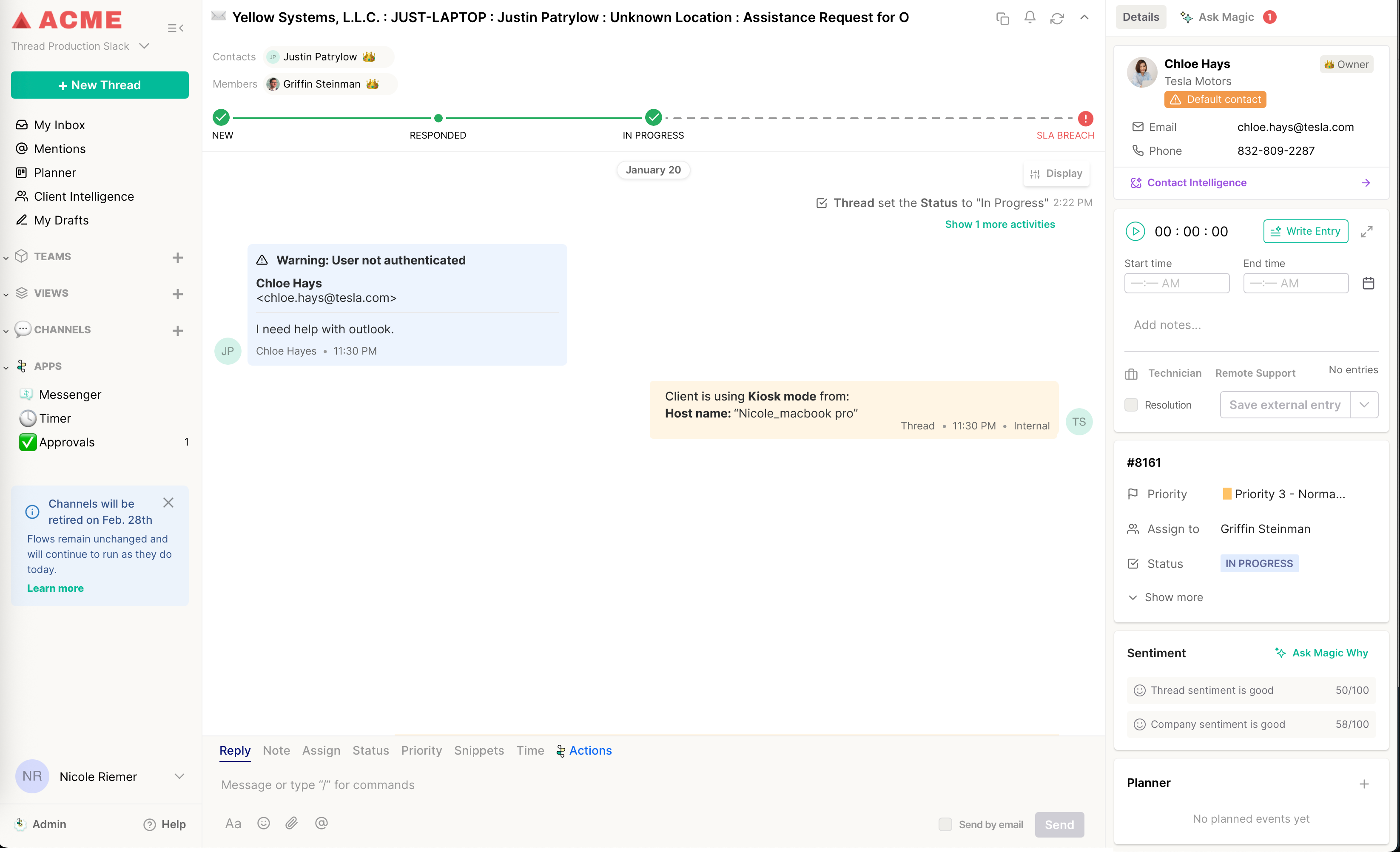 Instead of requiring individual credentials, Kiosk Mode attributes all conversations from a shared device to a single placeholder contact you configure in advance. The device hostname is displayed alongside every conversation in your Inbox so your technicians always know exactly which machine is reaching out.