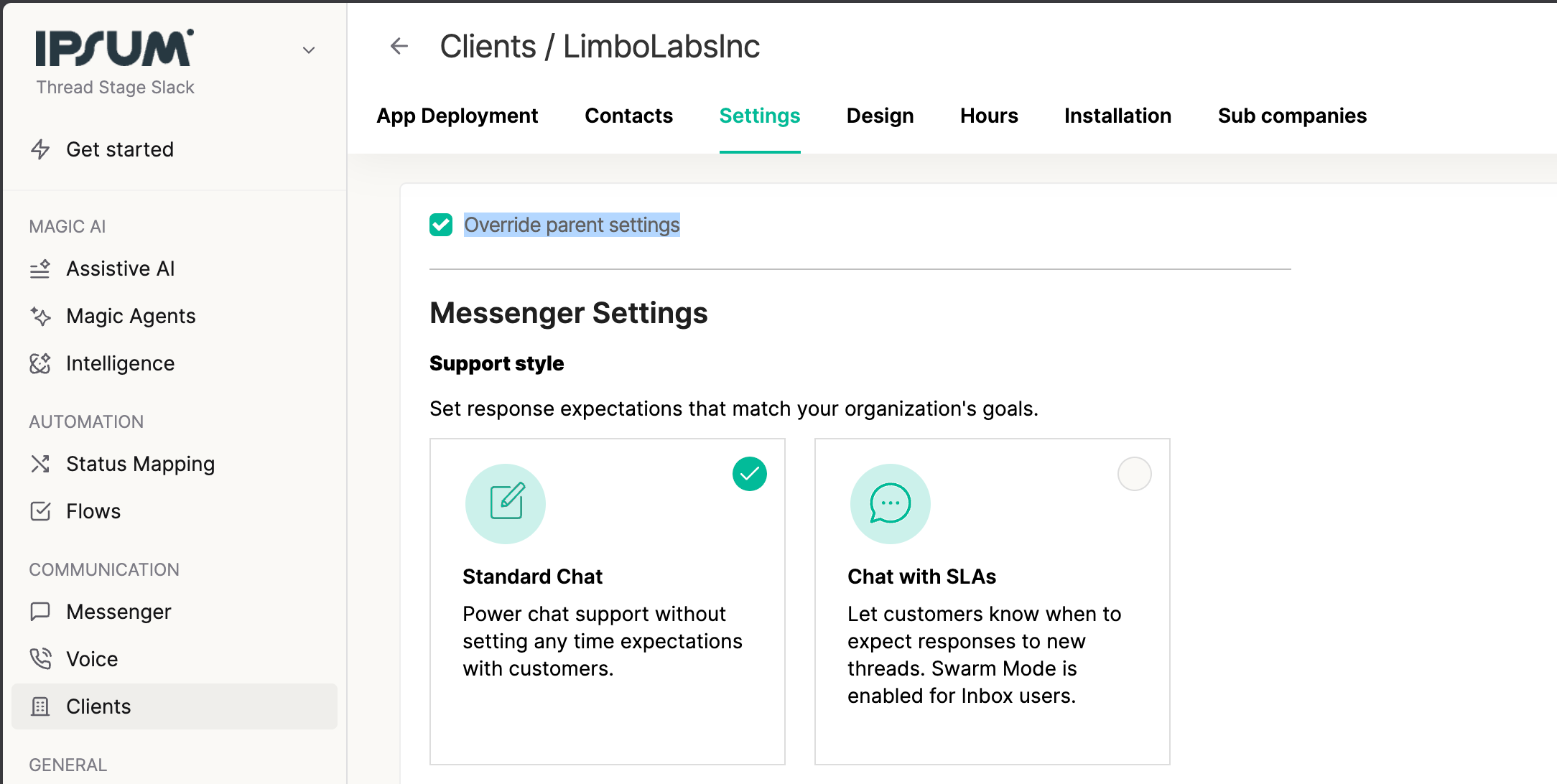 - Open the Settings tab for the relevant client