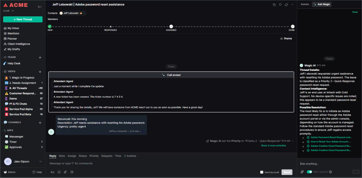 - Reduced Research Time: "Ask Magic" automatically suggests relevant knowledge articles during active conversations, so you never have to leave the thread to search for a fix.