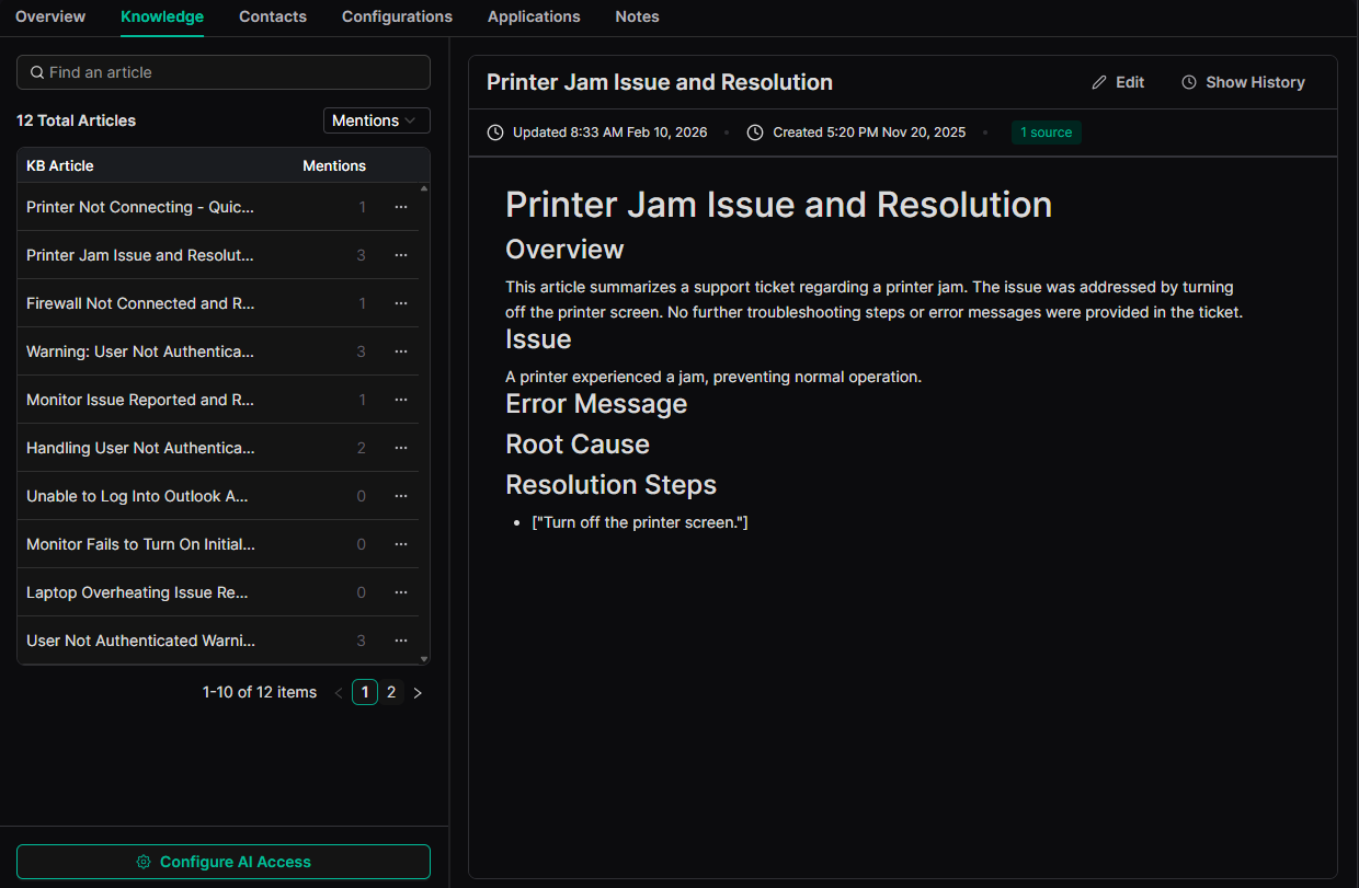 - Automated Knowledge Base Building: Articles are auto-created and updated based on actual ticket resolutions, removing the burden of manual documentation.