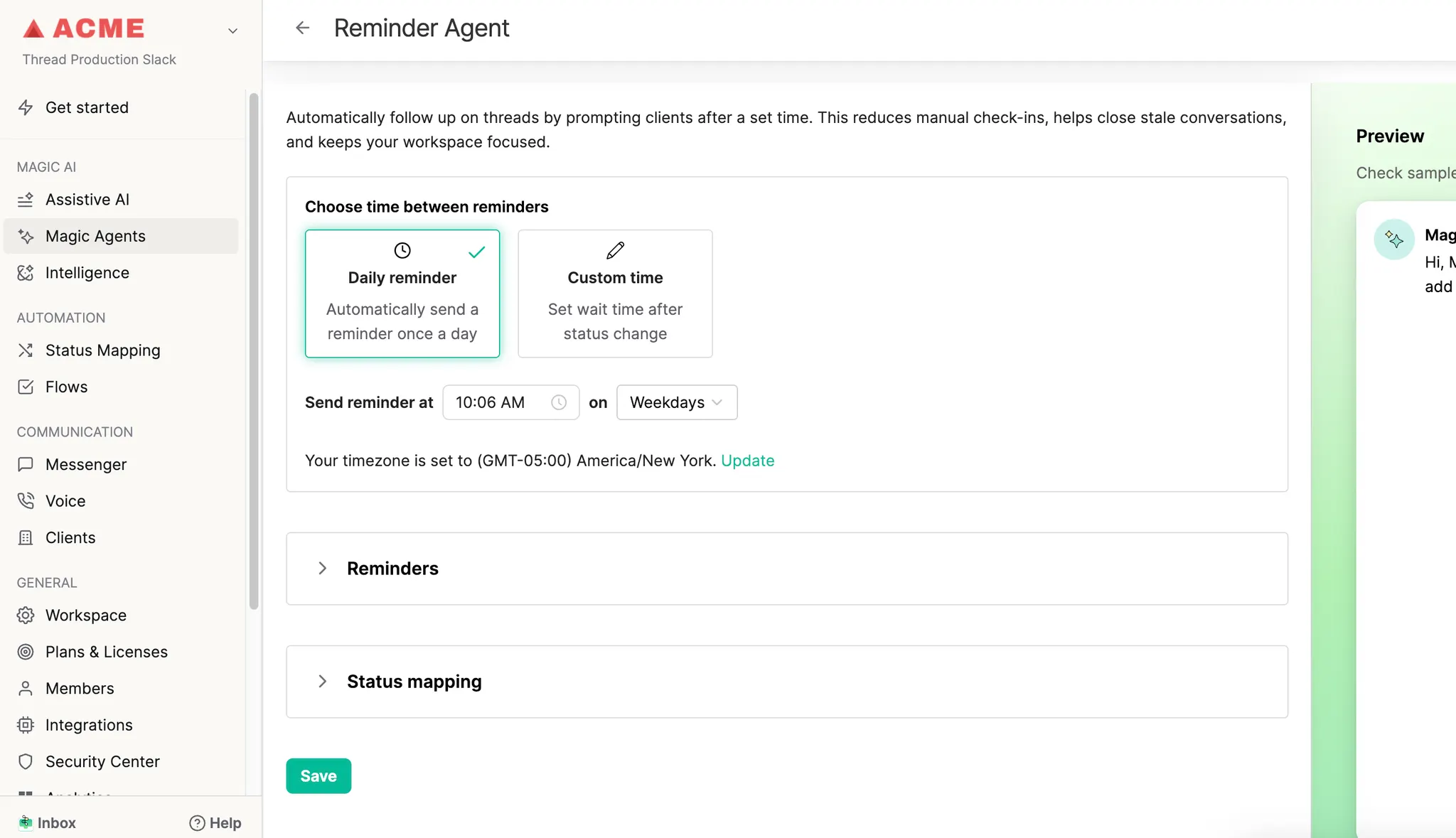 - Settings: 9:00 AM, Weekdays only, Company timezone: America/New_York