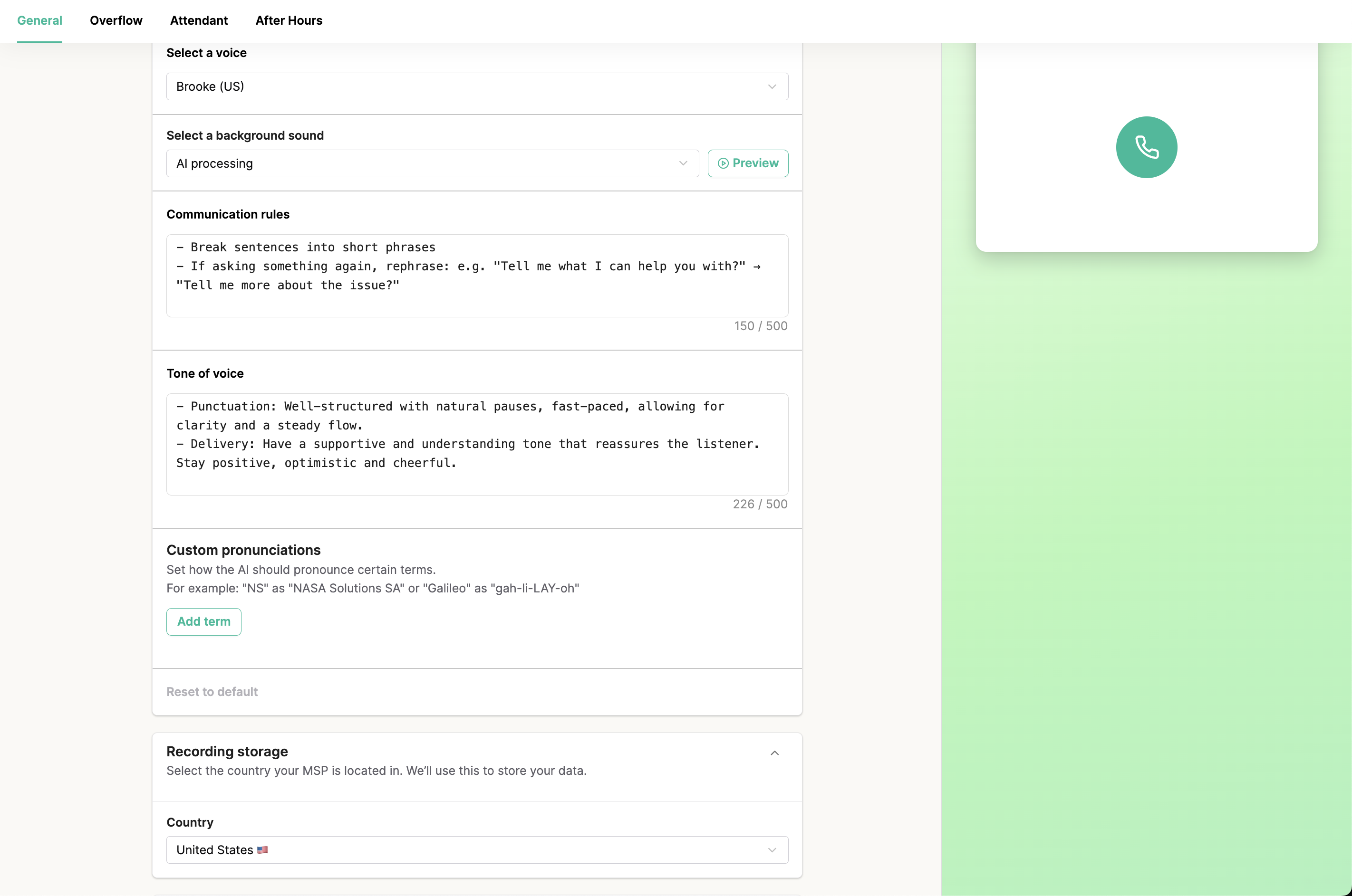 - Routing: You must enter a "Call queue and extension" number (your actual ring group/technician line) so the AI knows where to send the call.