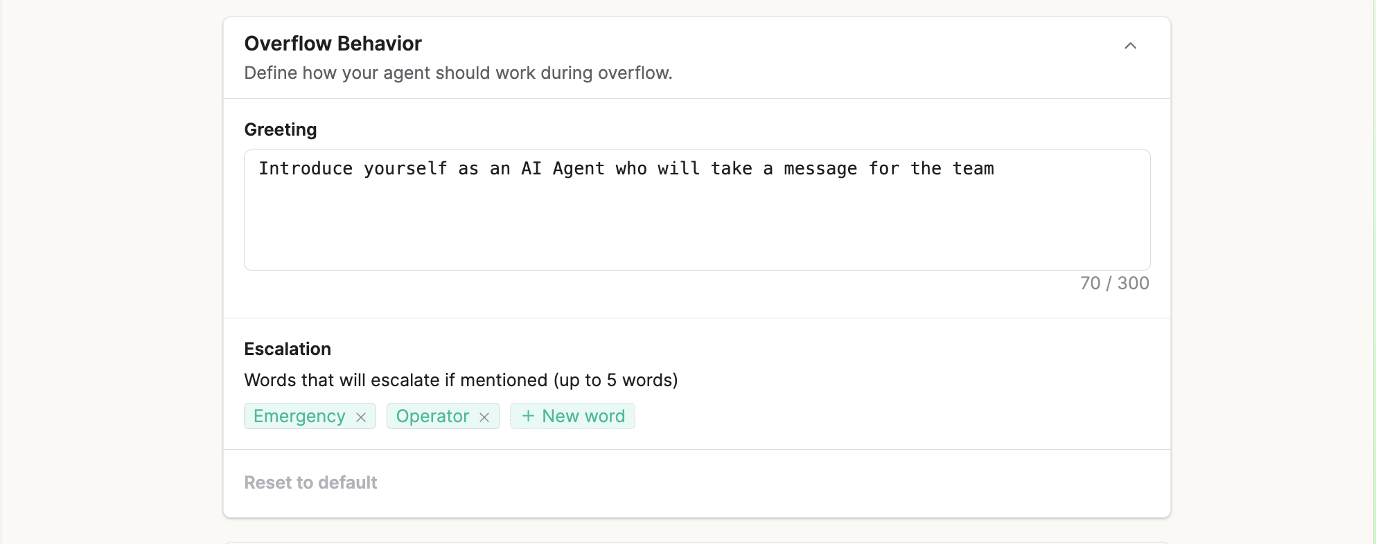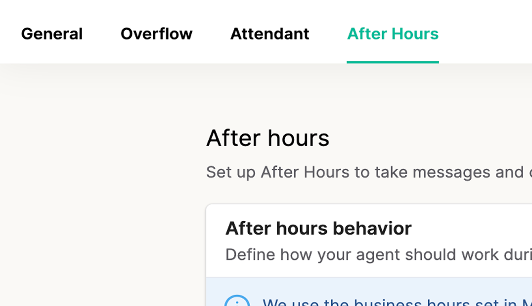 - Define how the agent behaves when your business is closed (typically similar to Overflow but with an "Office is closed" greeting).