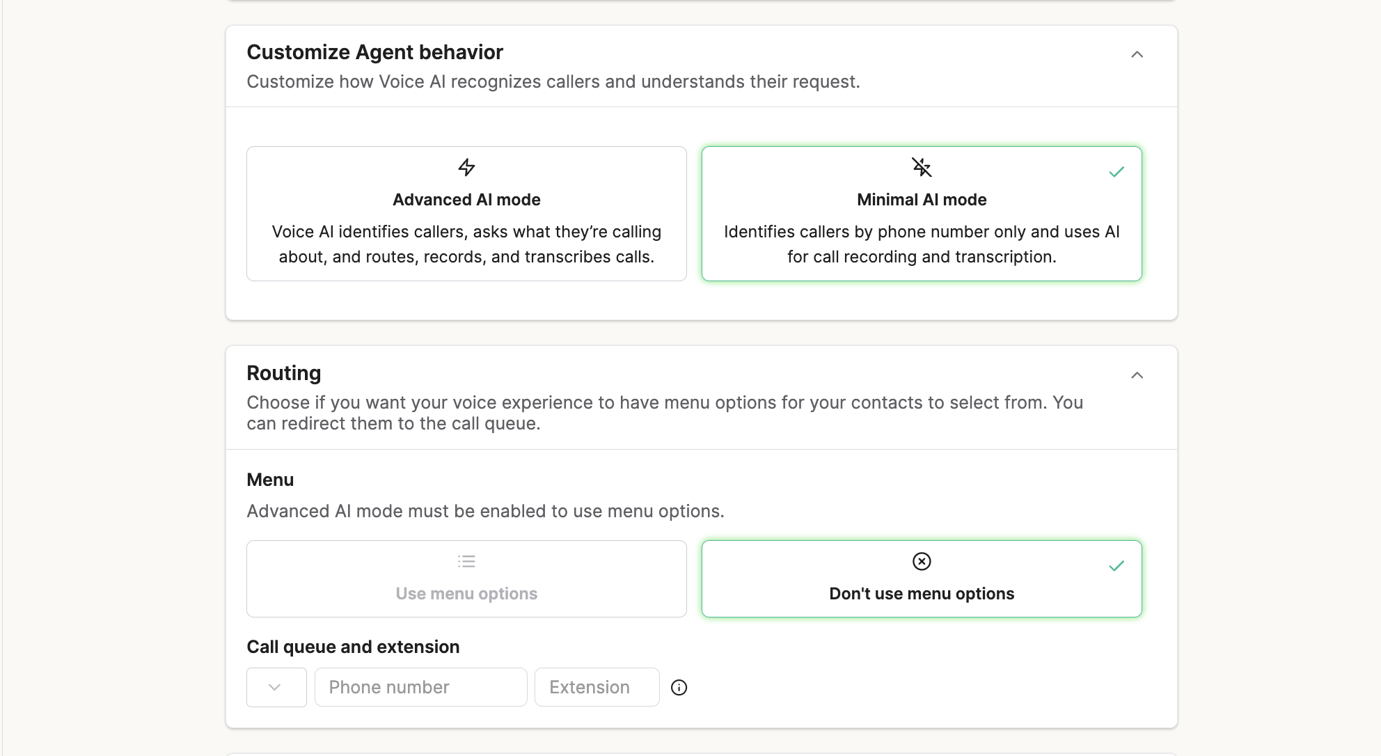 Feature | Minimal AI Mode (Passthrough) Option A | Advanced AI Mode (Full IVR) Option B |