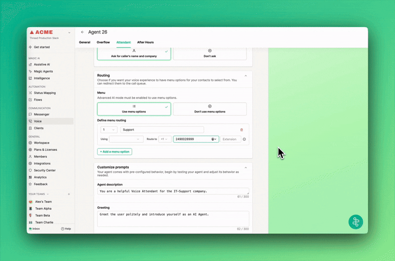 - Enter the Thread Voice AI phone number (formatted as +1XXXXXXXXXX).