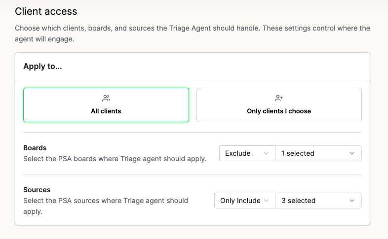 - Select which sources should run Triage Agent. Again, you can choose to include/exclude.