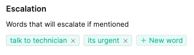 Escalation words help the Agent recognize when a contact’s message needs to be prioritized or handed off to a human technician. When any of these words or phrases are detected, the Agent will automatically escalate the conversation.