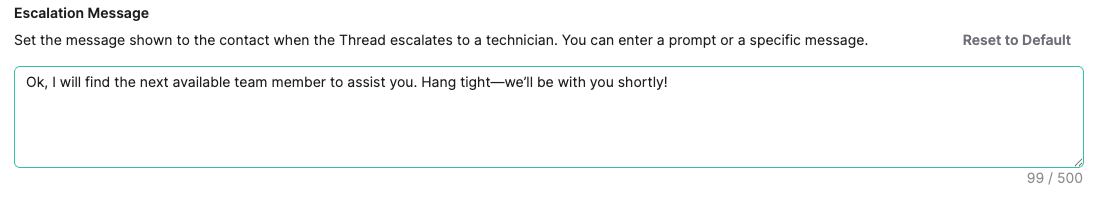 The Escalation Message is the response shown to the contact when a thread is escalated to a technician.