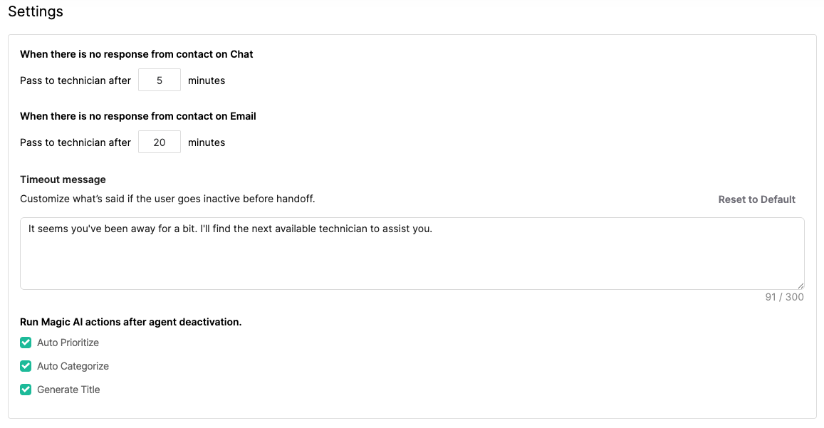 The Settings page defines how the Triage Agent behaves when there is no response from the contact and what happens when the Agent deactivates. These options ensure a smooth handoff to a technician and proper thread handling even when the contact becomes inactive.