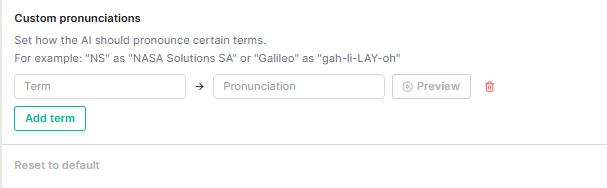 You can use custom pronunciations to help standardize how the agent says specific words. You can preview the pronunciation using the "preview" button, but we recommend also testing this when you have your agent fully set up by calling the Agent phone number.