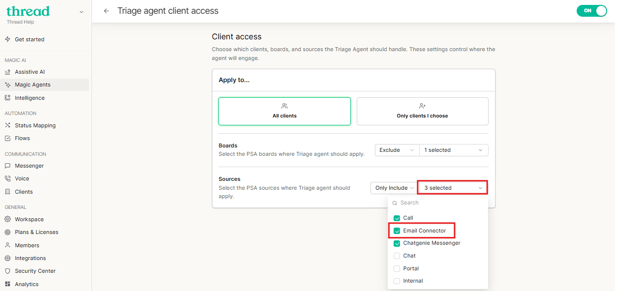 In the Thread Admin panel, navigate to Magic Agents → Triage Agent (Manage client access) → Apply to. Under the Sources option, ensure that Email is selected, then click Save.