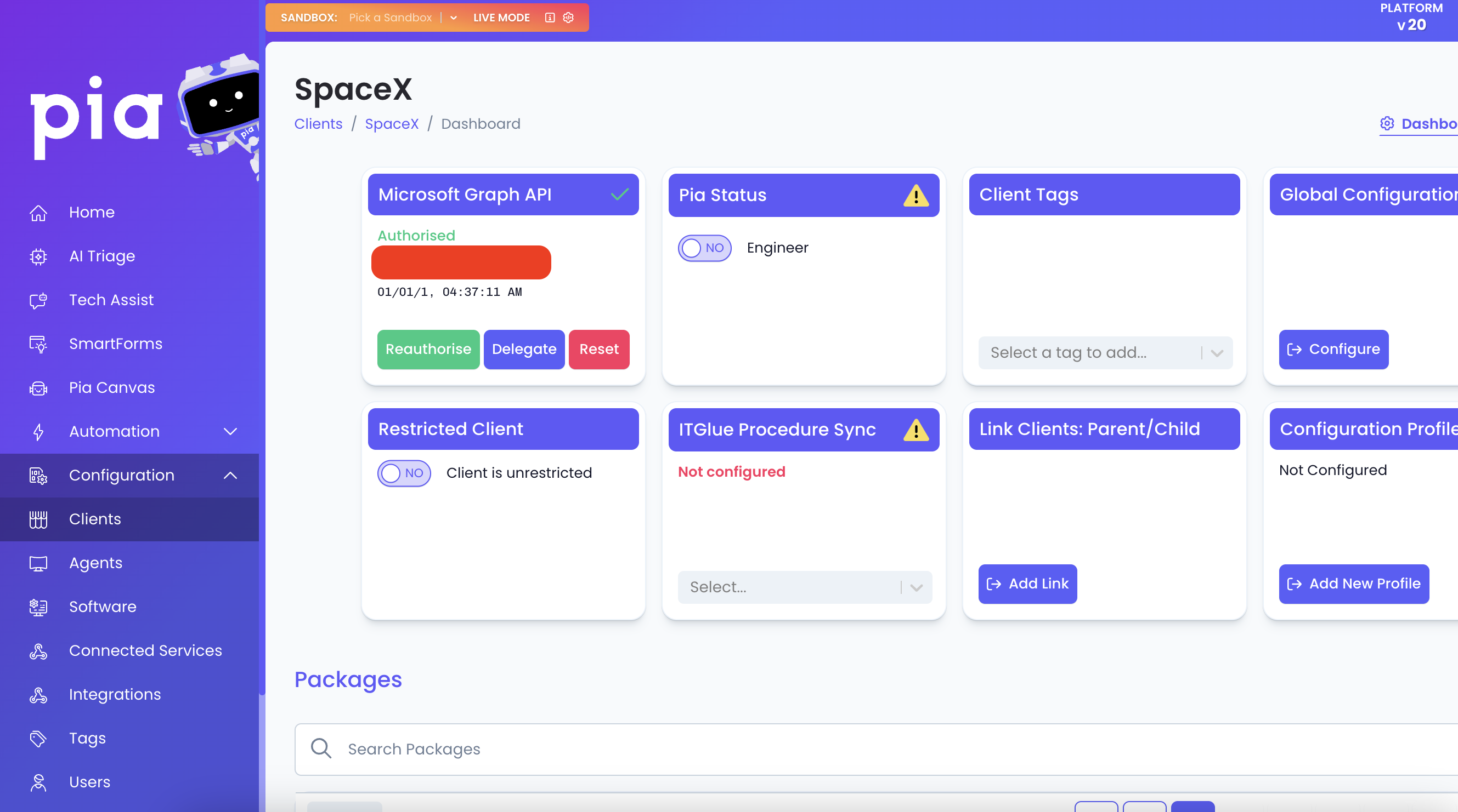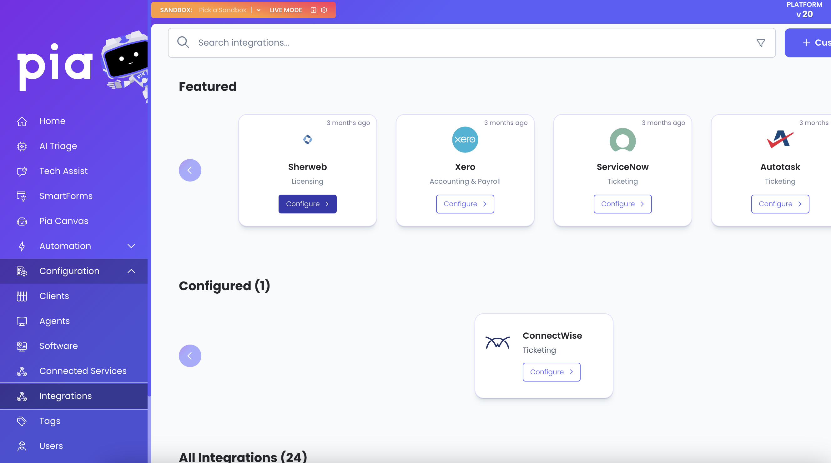 - PSA Connection: Your PSA (Autotask, ConnectWise, or Halo) must be successfully connected and active in Pia → Integrations.