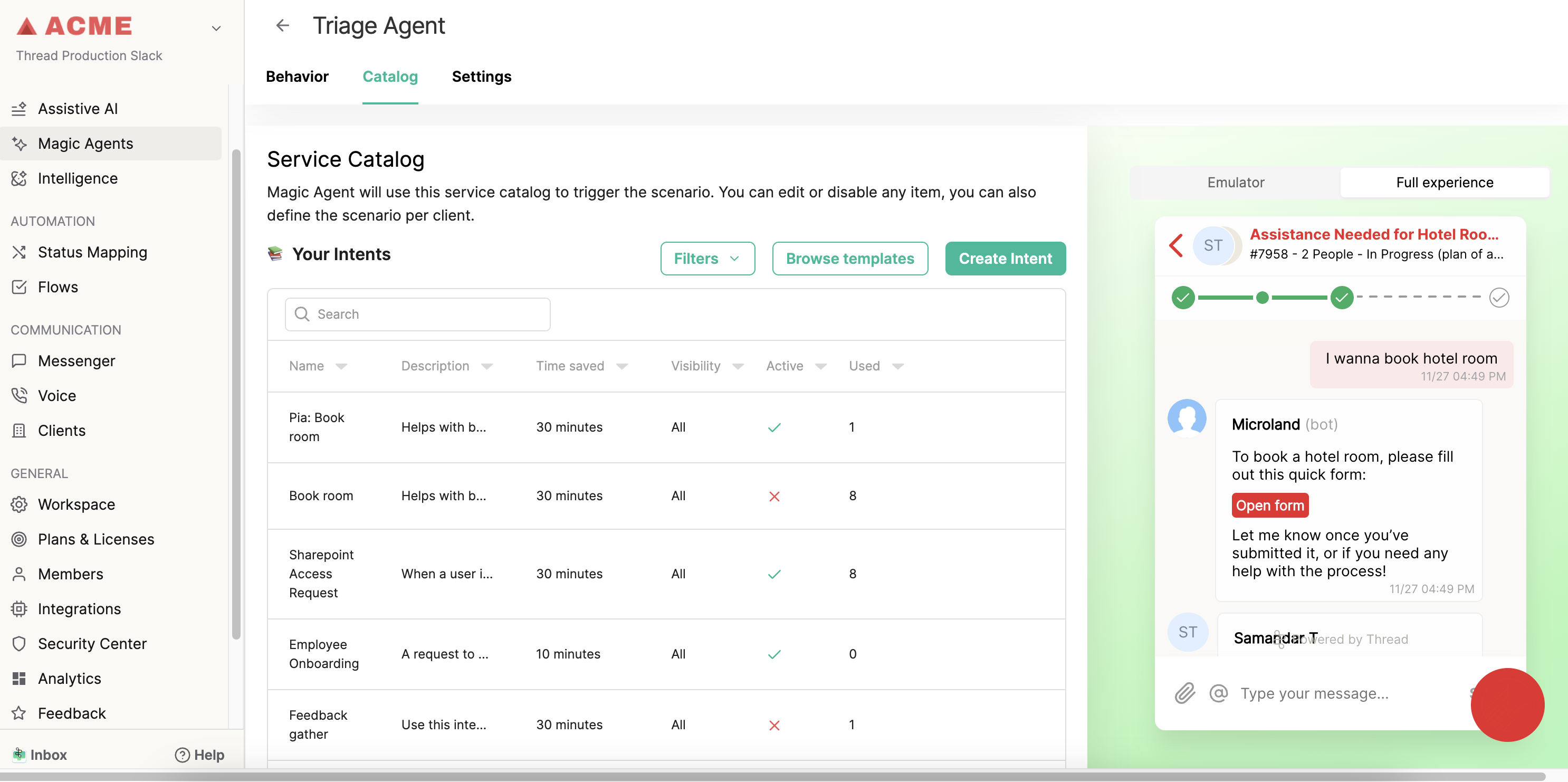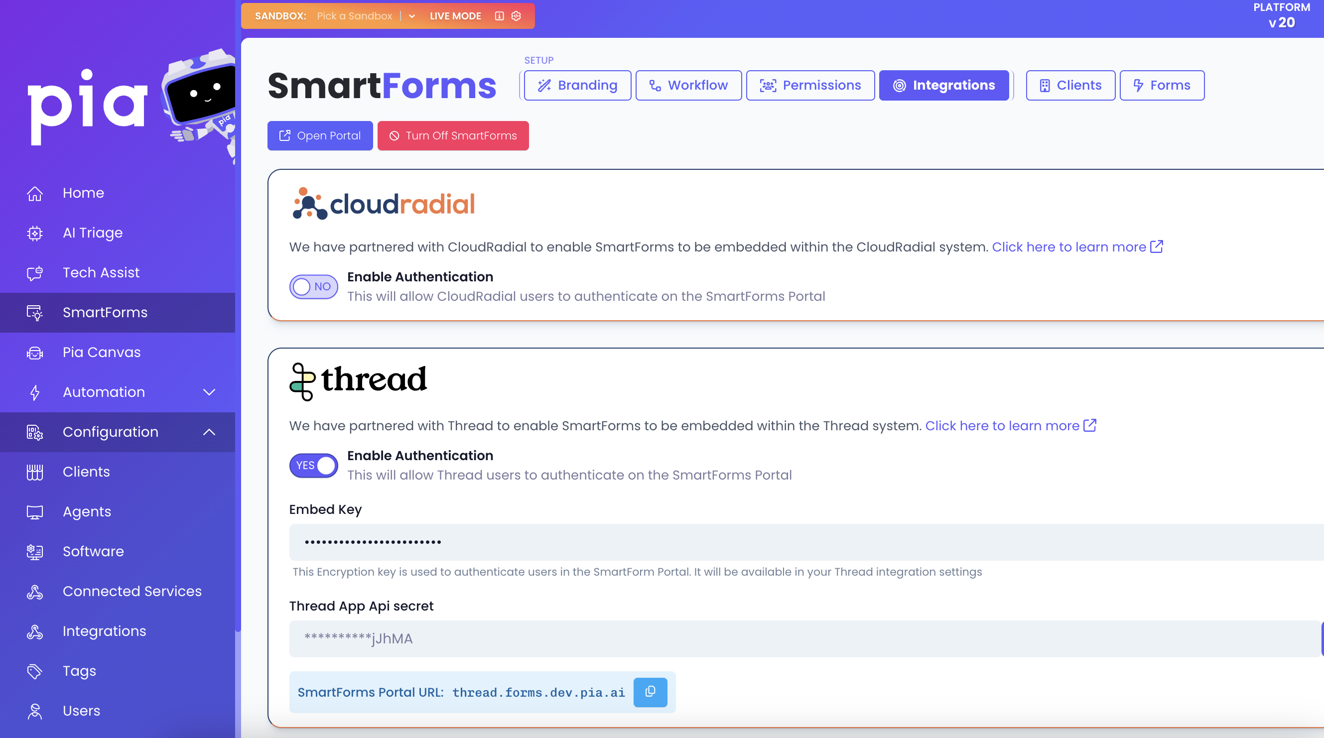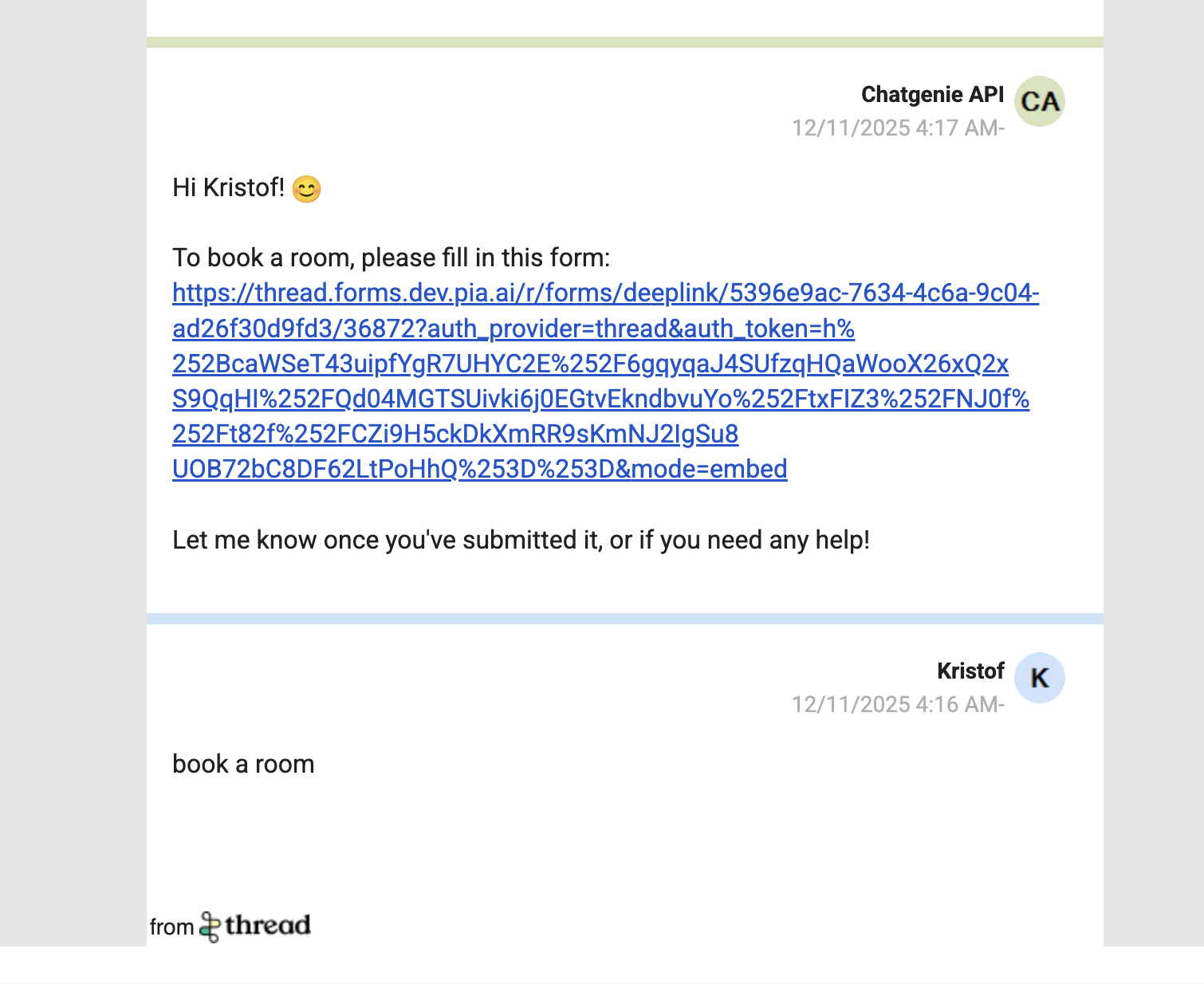 This integration connects Thread with Pia to automate complex workflows directly within the chat interface. By linking these platforms, you can trigger Pia SmartForms (such as User Onboarding, Password Resets, or Access Requests) immediately when a user expresses a specific intent.
