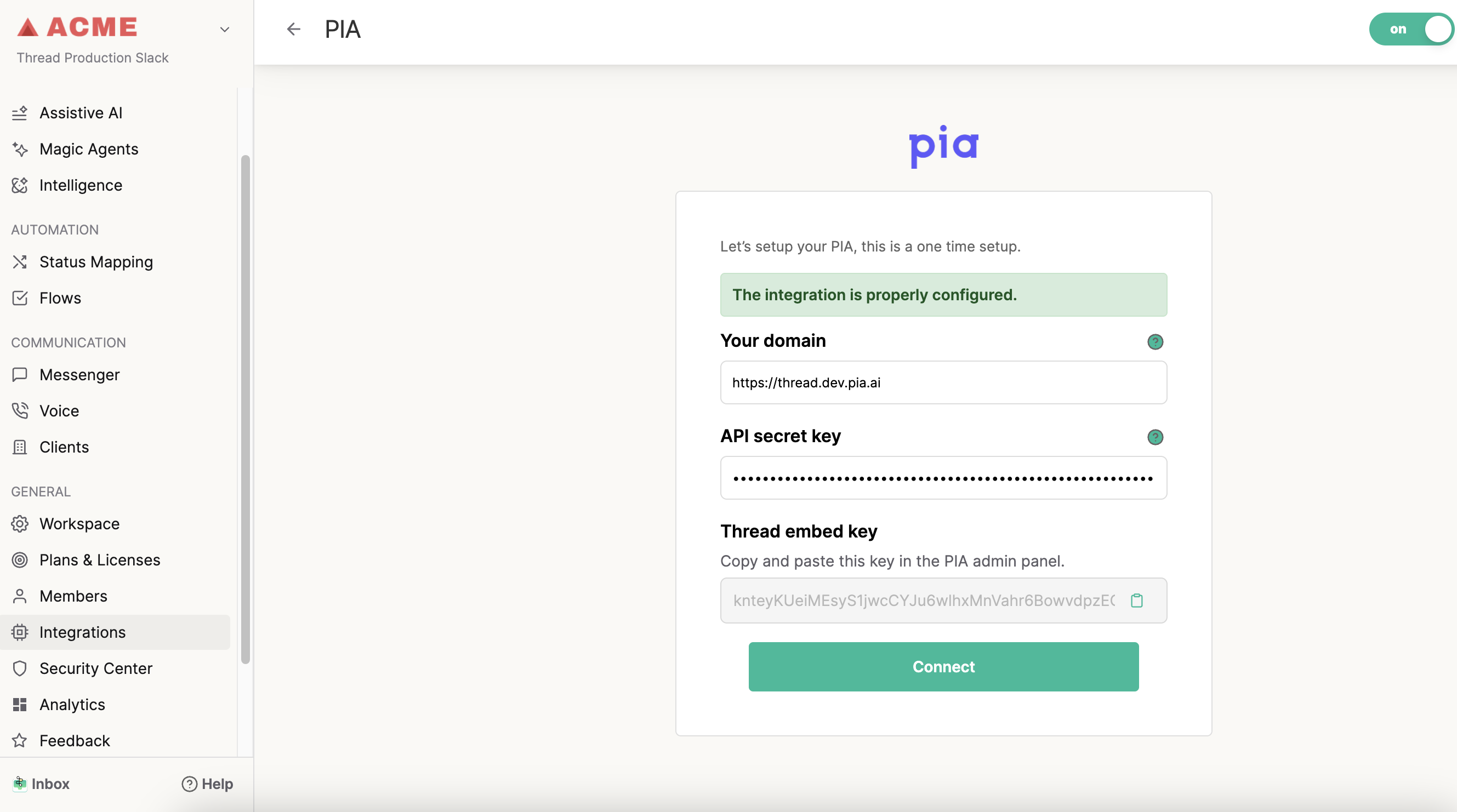 - From Pia to Thread: Copy the "Thread App API secret" from Pia and paste it into the "API secret key" field in Thread.