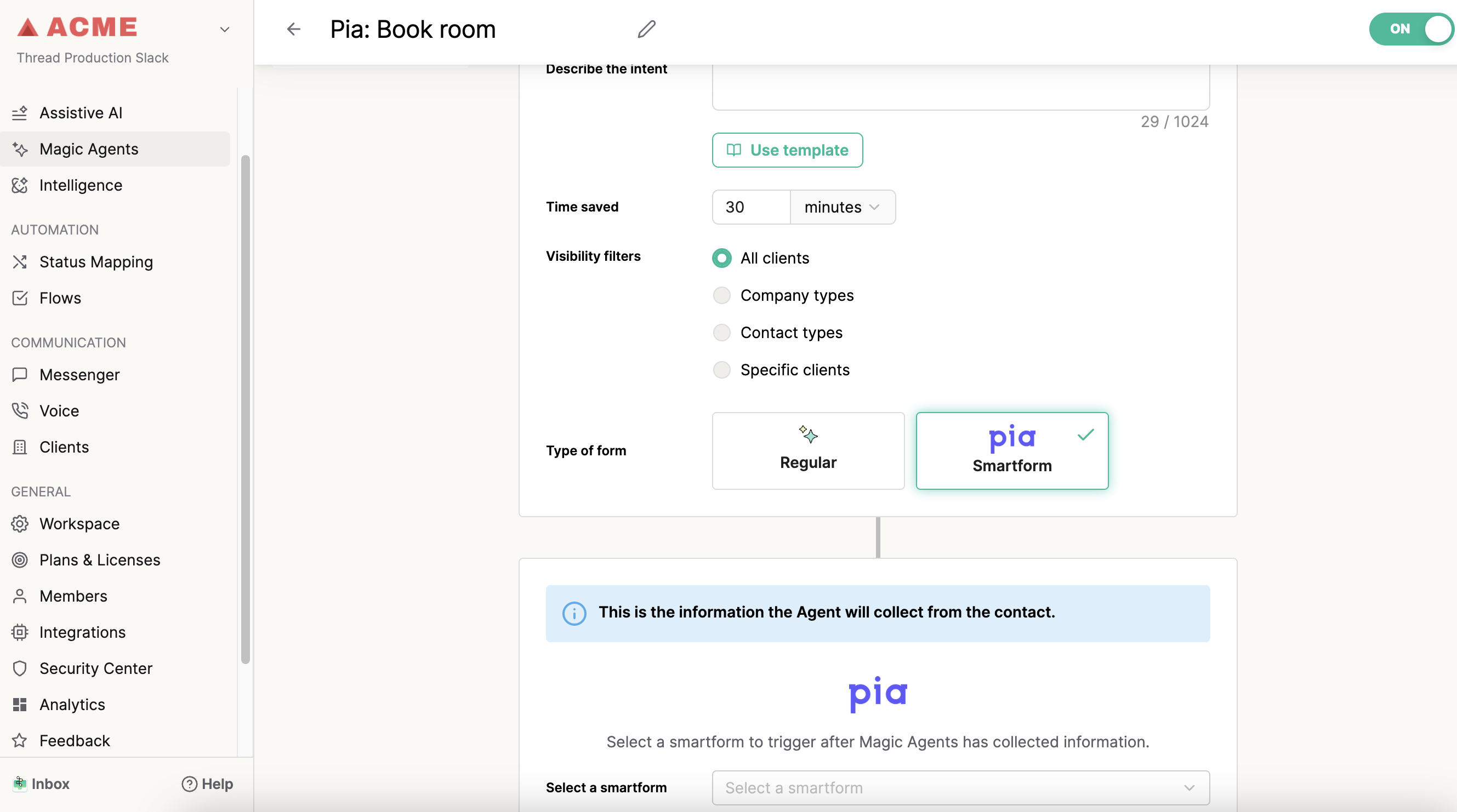 - In the intent settings, enable the option to use a Pia SmartForm.
