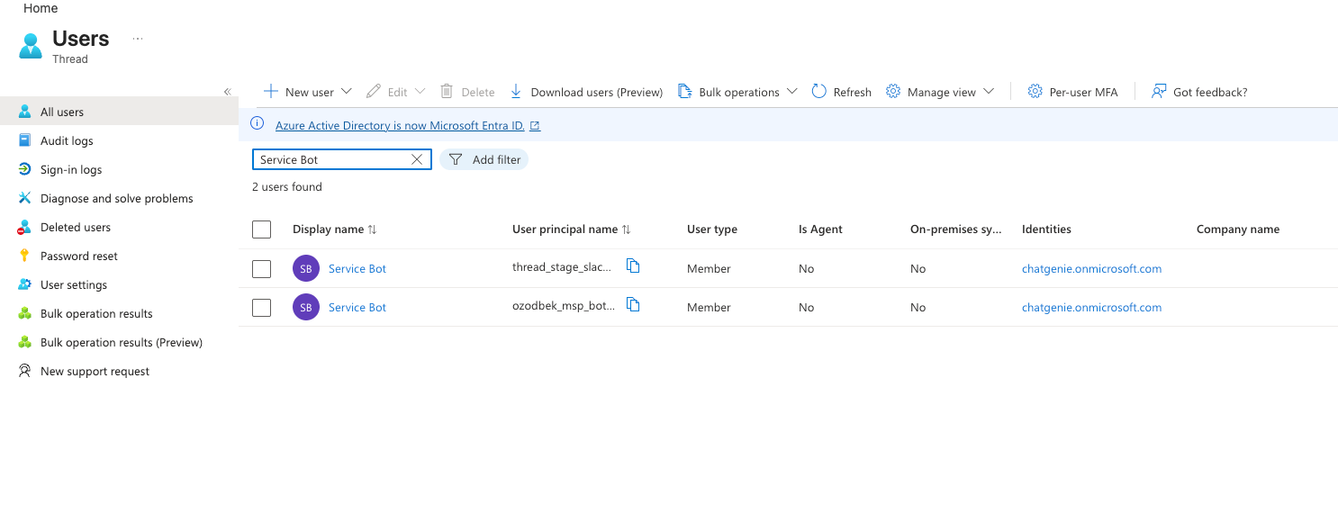 A: It may be there has been a previous deployment of a Thread service app (or Chatgenie for you OG's). To fix this remove any existing published apps from Enterprise applications in Teams. See this link.