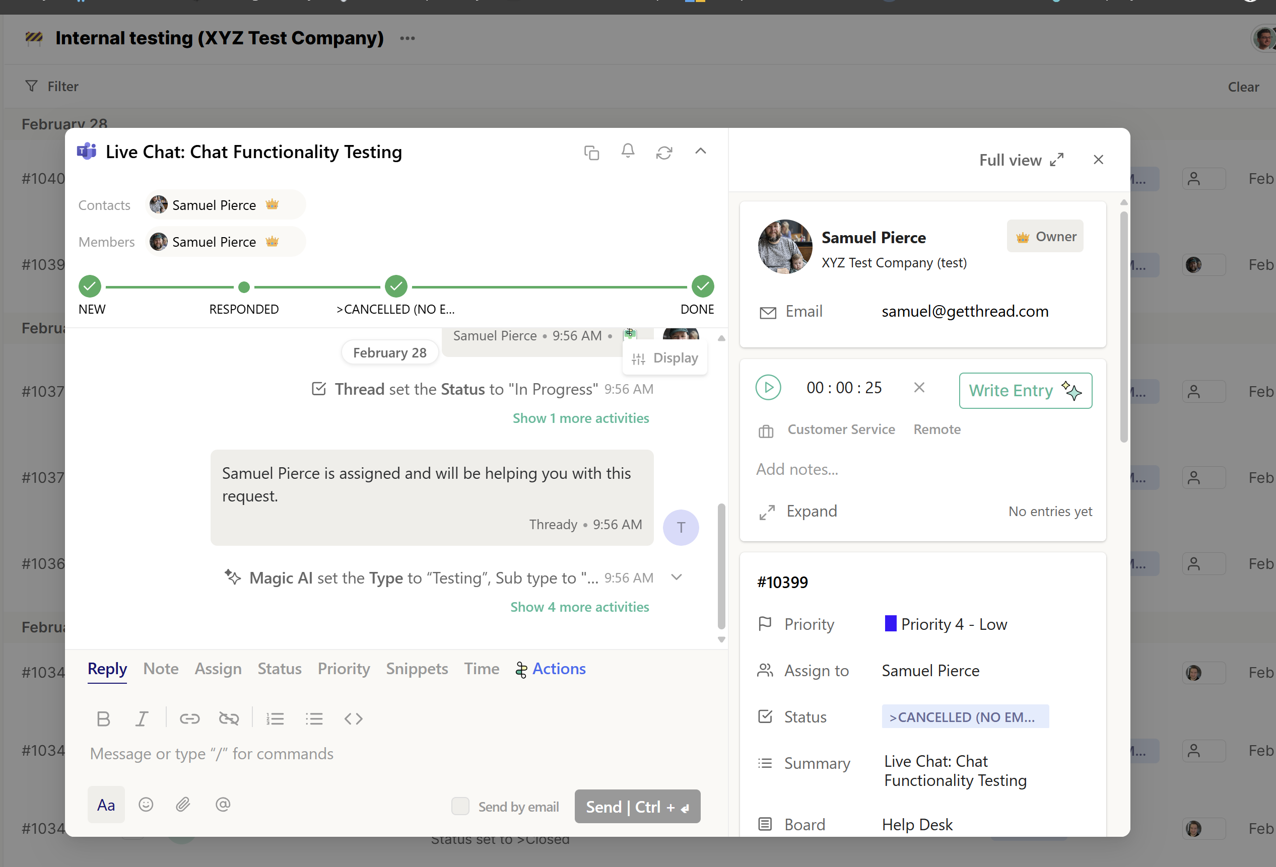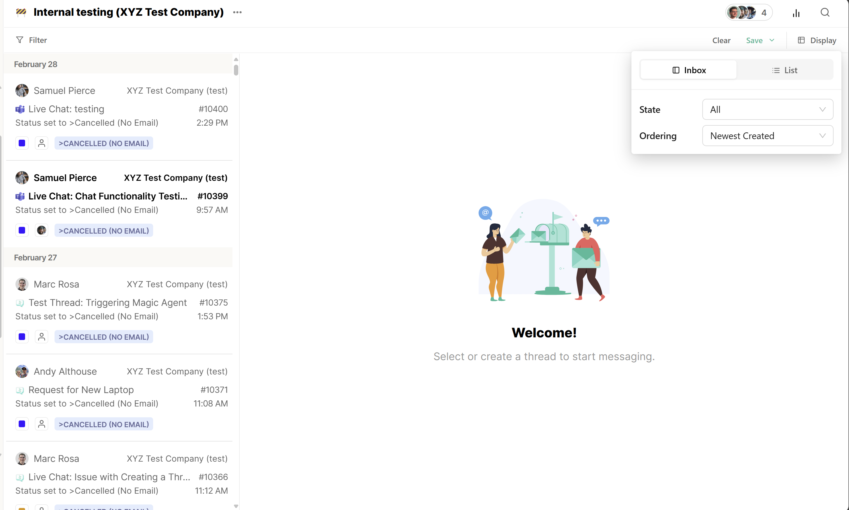 First we will cover Inbox view mode. Inbox mode is the traditional layout you have come to know and love from thread. The column on the left hand side lists all of your tickets ordered in the method set in the display portion. If the ticket is highlighted it means it is unread. If you see a blue dot, it means the last reply came from the contact.