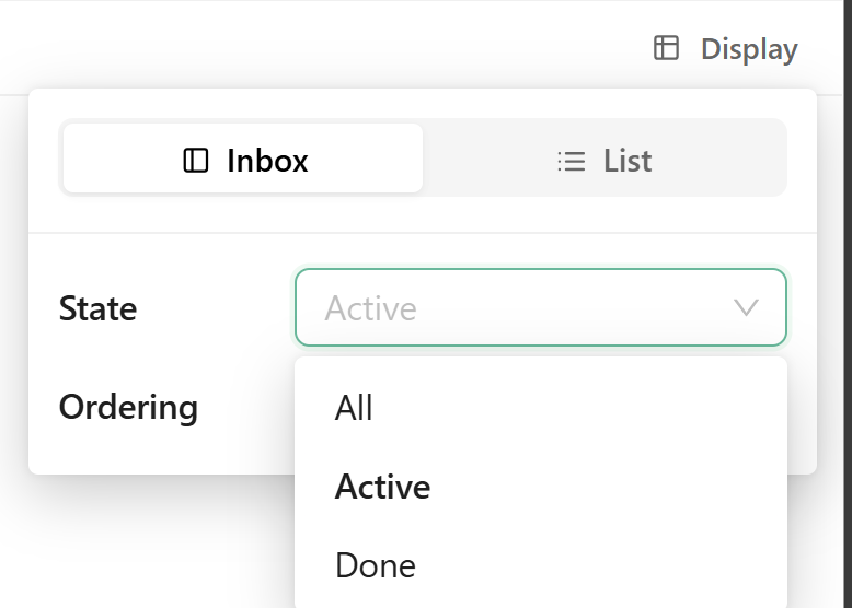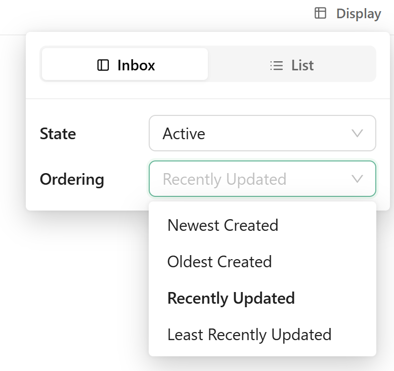 There are two display options for view, first is the inbox view and then the list view. In the display you can also set how you sort the columns.