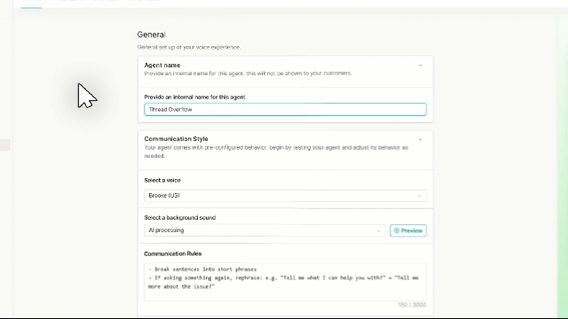 - Communication Style: Select voice profile ,Background Noise, and Communication Rules (Default Settings Recommended).