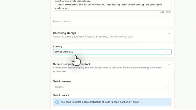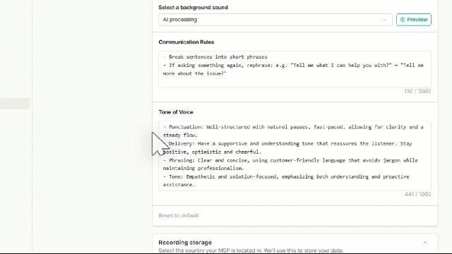 - Tone Settings: Define Punctuation, Delivery, Phrasing, and Tone, then select your Recording Storage Country .(Default Settings Recommended) .
