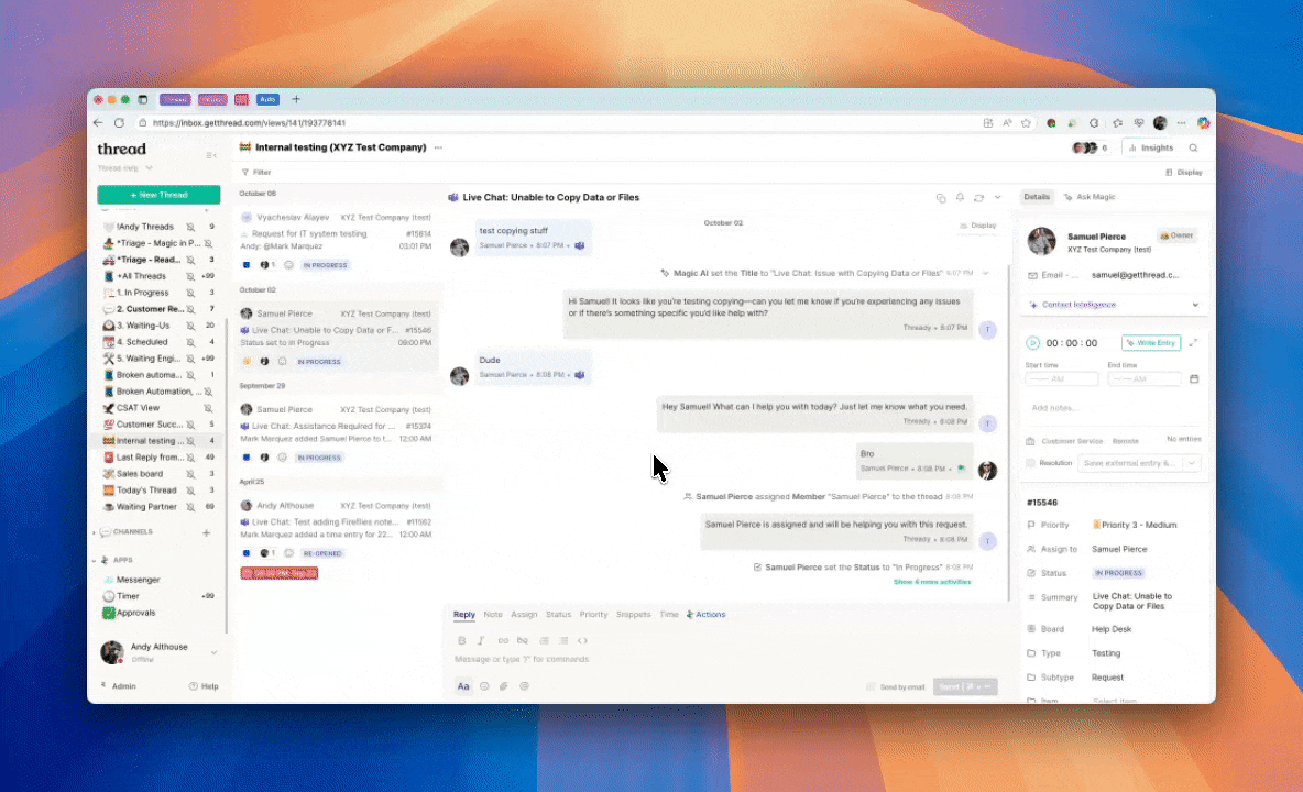 The Control Panel keeps all thread-related details in one place — giving you instant visibility into the contact, context, time tracking, and AI insights for the thread you’re viewing. From here, you can log time, review sentiment, update ticket information, and access related activity without ever leaving Inbox.